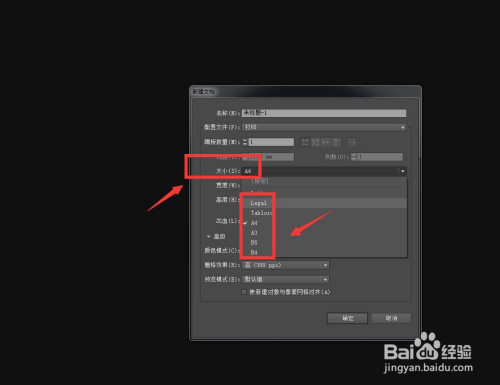 在大小这里,点击小三角,可以设置为A4,A3等常规尺寸,直接选择。