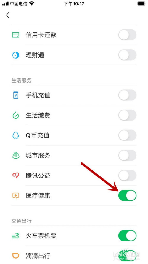 跳转新页面后,查找并点击【医疗健康】右侧按钮,按钮变暗就当作功埋没了。