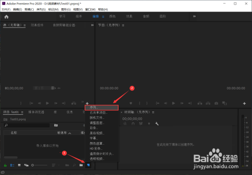 接下来,就呈现我们的本家儿界面了,因为我们要用图片建造视频,所以我们要设置个“序列”,点击图中标注的位置,然后点击“序列”;