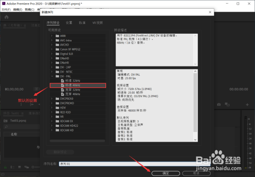然后就弹出“新建序列”的界面,因为我们是快速入门,就直接按照默认设置,直接点击“确定”就行;
