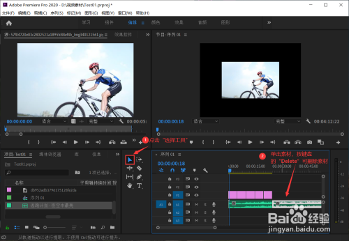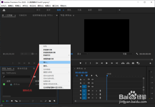 再接着,我们注重左下角的区域,那是我们导入素材的区域,我们可以鼠标右击,点击“导入”(也可Ctrl+I快捷键导入),导入我们所需的素材,单击素材还可以在左上方预览素材;