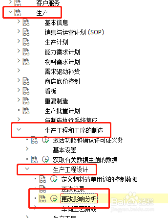 点击'出产',睁开子项,选择'出产工程和工序制造' —>'出产工程设计' —>'更改影响阐发' ,点击执行