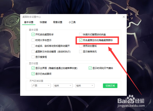 勾选“双击桌面空白处埋没桌面图标”,封闭设置窗口,双击桌面空白处即可埋没全数图标。