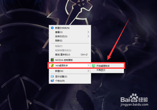 右击桌面空白处,选择“360桌面助手”,点击开启“桌面助手”。
