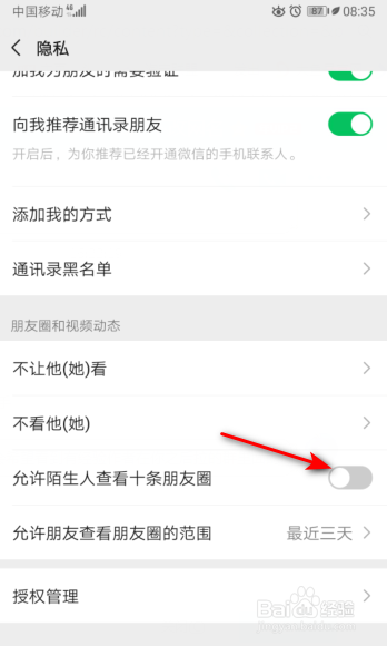 之后将许可目生人查看十条朋友圈的滑动按钮标的目的左滑动。