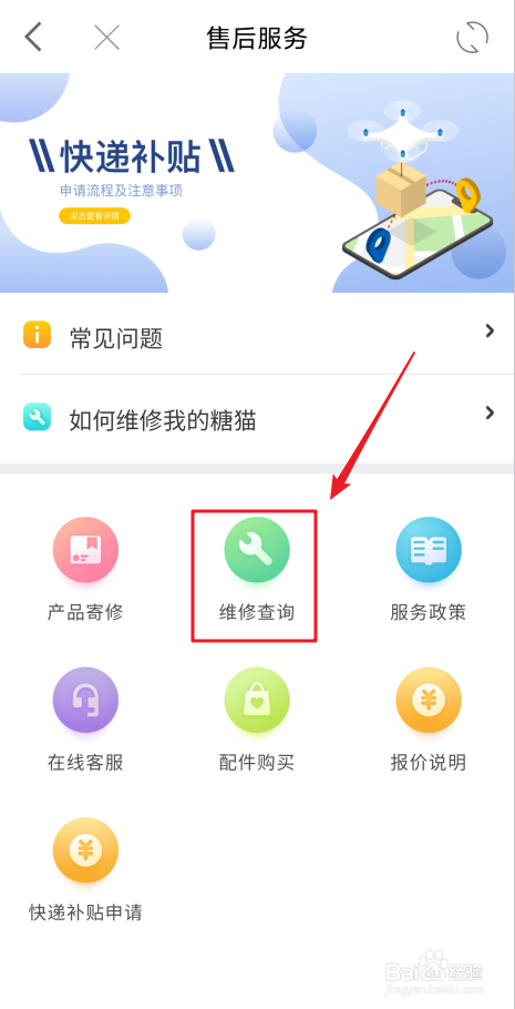 在“售后办事”页面,点击“维修查询”按钮。见下图