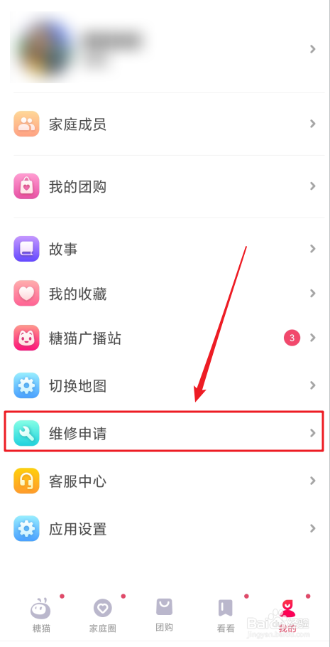 在“我的”页面,点击“维修申请”地点行肆意位置。见下图