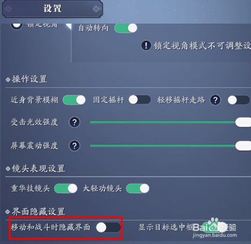 4、将移动和战斗时埋没界面的开关按钮打开。