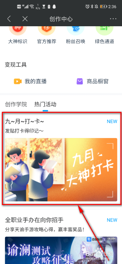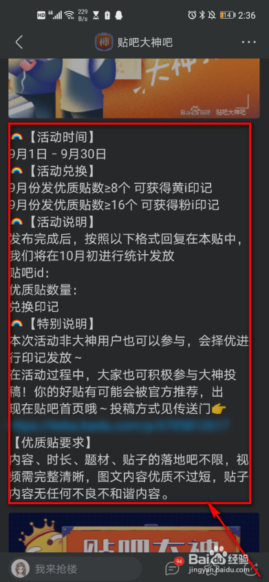 END1、解锁手机,点击百度贴吧。2、点击右下角我的图标。3、在创作中间处,找到热点活动,点击进入。4、选择肆意一个活动,点开它。5、界面跳转,即可查看活动的具体申明。