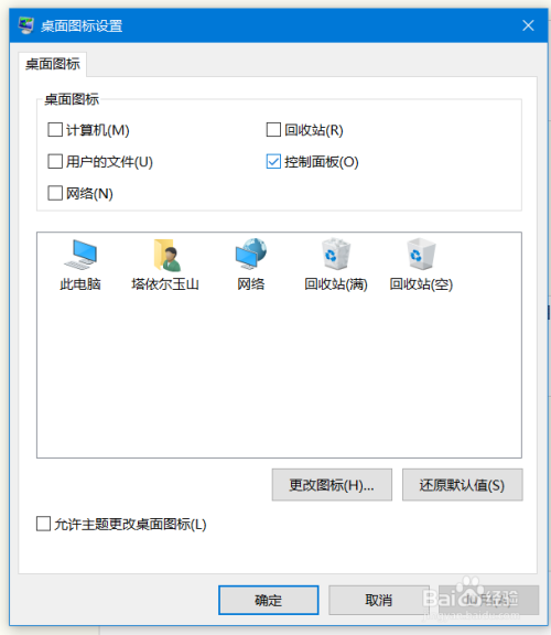 打开 桌面图标设置 后 勾选“节制面板”,选完后单击“确定”