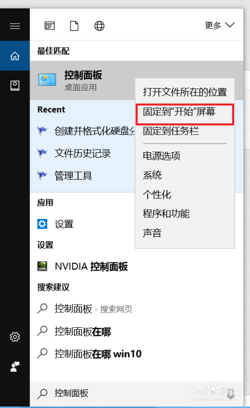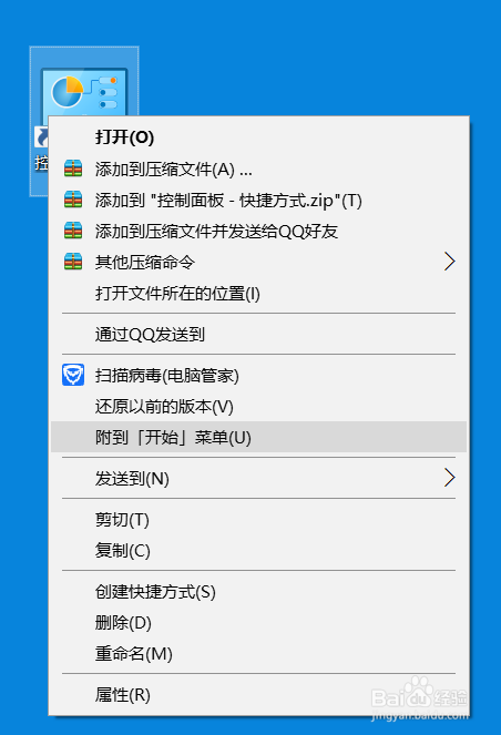 用鼠标右键单击 节制面板 快捷体例 ,选择“附到开始菜单”。