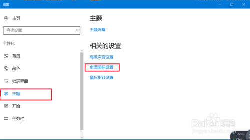 打开 个性化设置窗口后 选择 “本家儿题”,在 “相关设置”项目里的“桌面图标设置”。