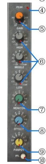 Peak 灯亮时,警告利用者输入信道内的讯号过强。发现 Peak 灯亮时,而且任由这种环境持续的话,调音台会启动自我庇护功能,堵截音源输出。所以,此时应调整输入音量大小,不然,调音台的音频输出将被主动堵截。可利用的节制包罗:Line -20 DB、减小Gain、拉低衰减器,一般以减小Gain为宜。 5.GAIN:增益旋钮
