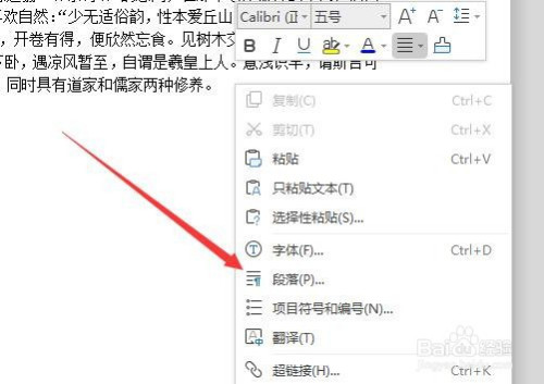右键点击文档,选择弹出菜单中的段落菜单项。