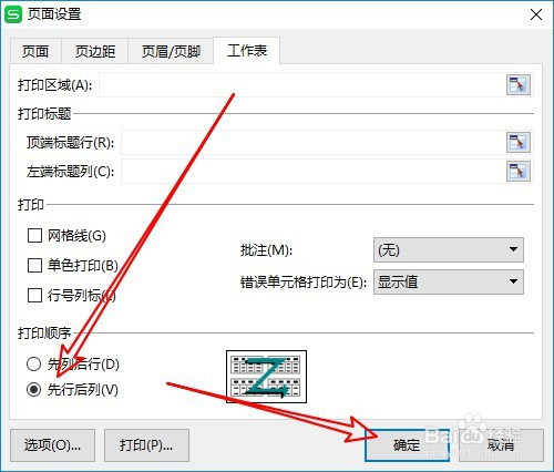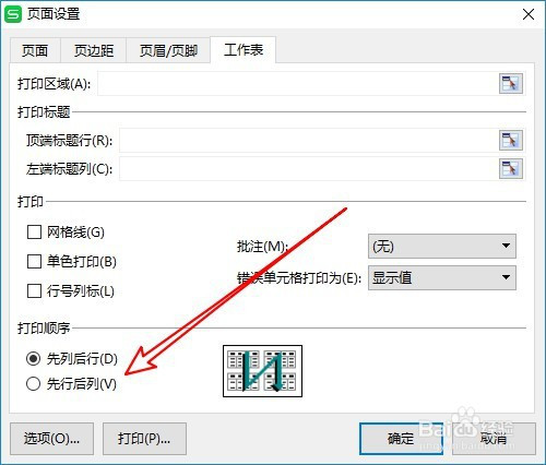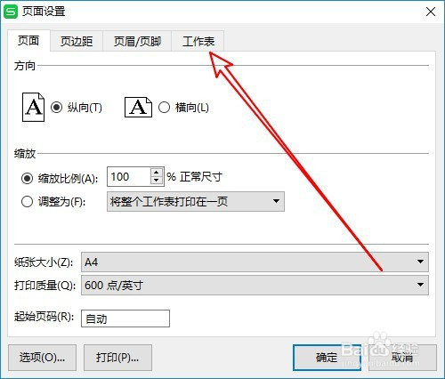 这时可以打开页面设置窗口,点击工作表选项卡。