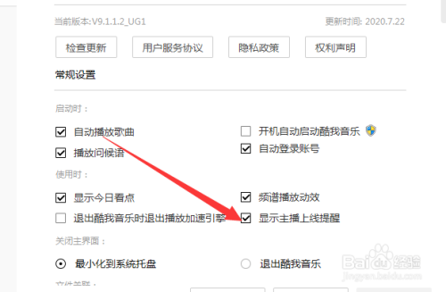 点击关于之后,右侧就会弹出新的界面,我们在界面中间就会看到一个叫做显示本家儿播上线提醒。