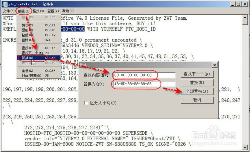 用记事本打开【ptc_licfile.dat】,然后点【编纂】,【替代】,查找内容输入00-00-00-00-00-00,替代为改为适才第一步记下的本家儿机ID。点击【全数替代】,保留。