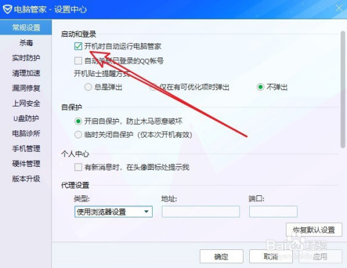 然后在打开的设置中间窗口找到并打消开机主动运行电脑管家的勾选就可以了。