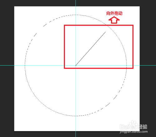 按Ctrl+R显示标尺,拖出两条标尺线,定位出圆心(即为两条标尺线订交处),如图所示: