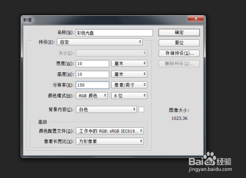 打开ps,新建一个10x10cm,分辩率为150的文件,如图所示: