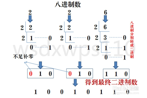 方式为:八进制数经由过程除2取余法,获得二进制数,对每个八进制为3个二进制,不足时在最左边补零。