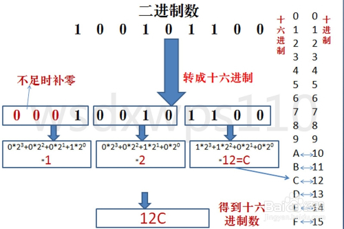 方式为:与二进制转八进制方式近似,八进制是取三合一,十六进制是取四合一。(注重事项,4位二进制转当作十六进制是从右到左起头转换,不足时补0)。