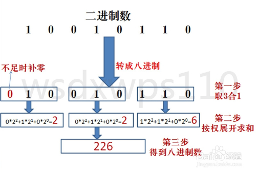 方式为:3位二进制数按权睁开相加获得1位八进制数。(注重事项,3位二进制转当作八进制是从右到左起头转换,不足时补0)。