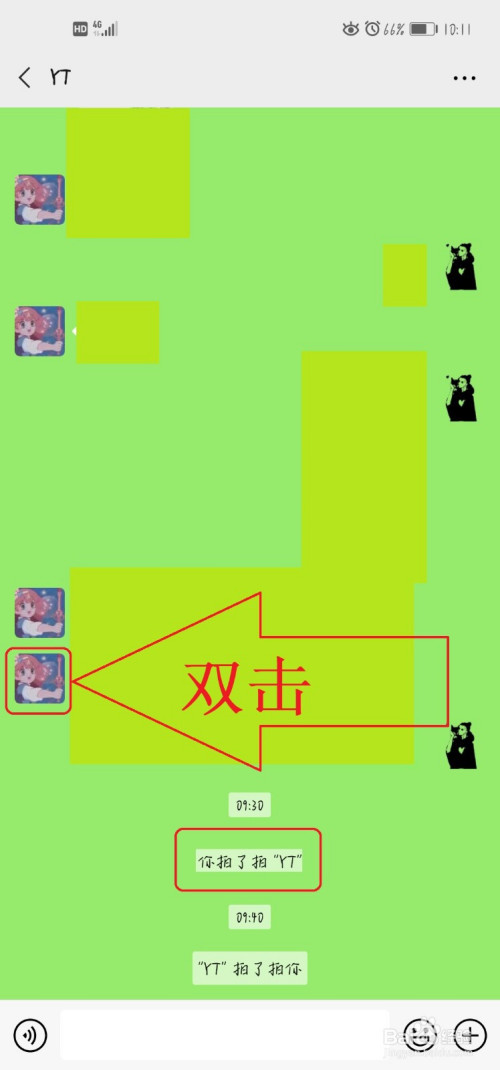 双击老友头像两下,然后可以看到头像抖了两下,而且聊天框会呈现——您拍了拍“某某”(如下图所示)