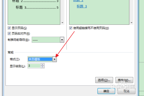 在弹出“目次”对话框中,点击格局右侧的下拉按钮。
