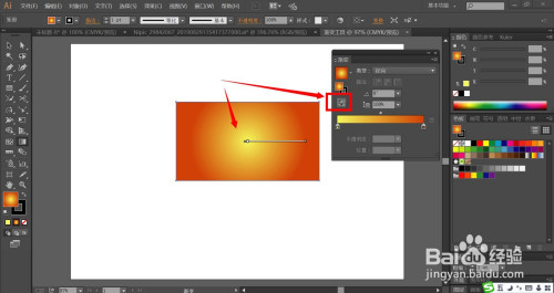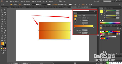 我们也可以点击渐变东西弹出渐变窗口进行更多的设置,设置渐变形式的线性,点击左侧滑动条为红色,右侧滑动条为黄色。从而让矩形呈现红黄色渐变结果。