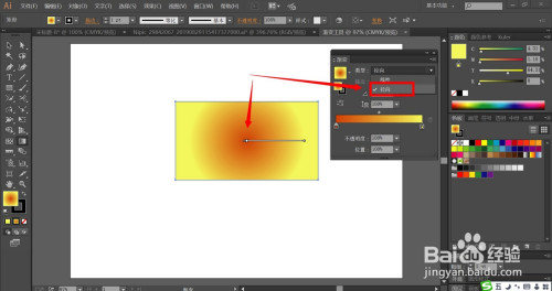 我们可以点击窗口左侧中心的反标的目的渐变,从而让滑动条的色块偏向发生摆布转变,让矩形呈现黄红色径标的目的渐变结果。