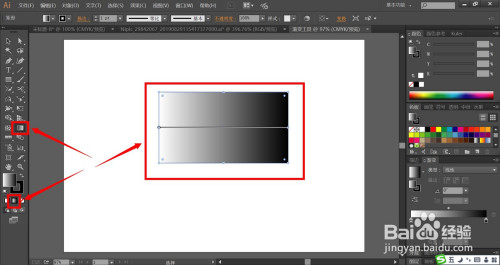 我们利用矩形东西在画板上面画出一个矩形,再点击左侧东西栏内的渐变东西,点击东西栏底部中心的渐变色彩,从而让口角渐变应用到矩形上。