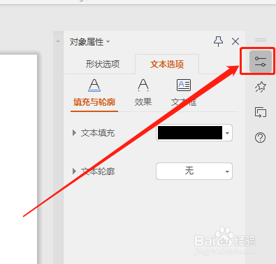 选中文本框,点击右侧“对象属性”按钮。如图:
