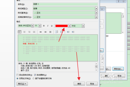 在弹出“点窜样式”对话框中,按照需要点窜格局栏中的字体颜色(好比点窜为:红色),点击确定。