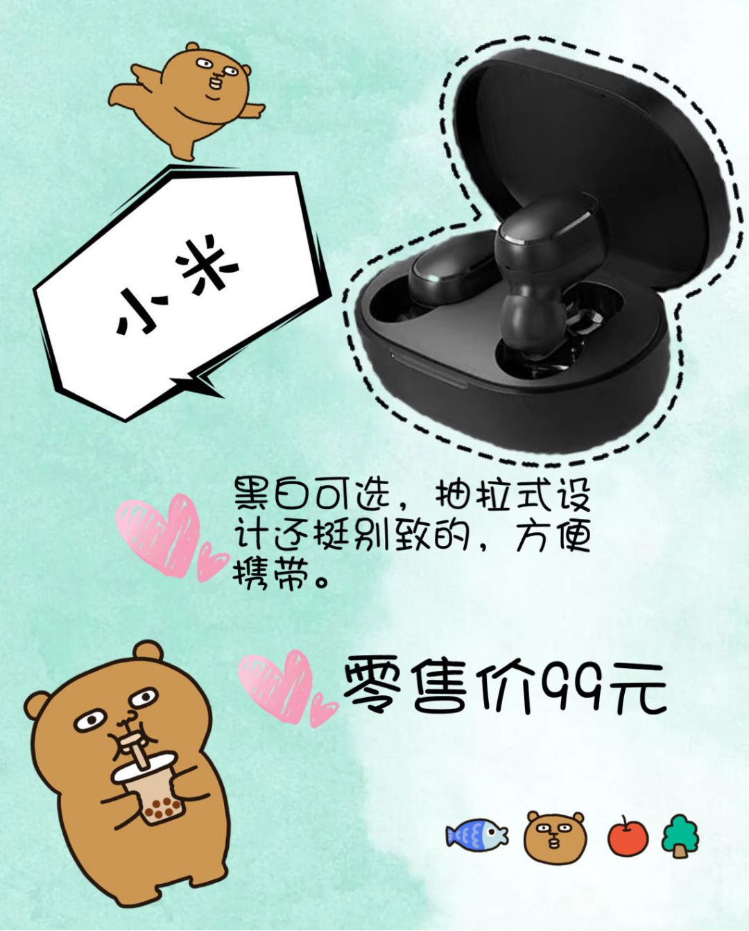 - 小米系列的蓝牙耳机总体上都挺好的,音质清楚,续航能力也不错,比上一代蓝牙耳机延迟方面有好转。口角可选,抽拉式设计还挺别致的,上面有一根挂绳,便利携带。利用过程中有呈现放入盒子中持续毗连的环境。