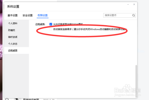 接着找到权限设置处的“长途桌面”,勾选主动接收毗连请求。
