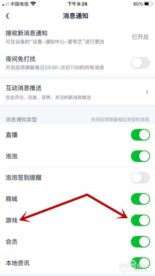 跳转新页面后,查找并点击“游戏”右侧按钮。