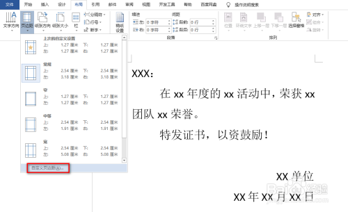 在“结构”选项卡下点击“页边距”---“自界说页边距”,具体如图所示:
