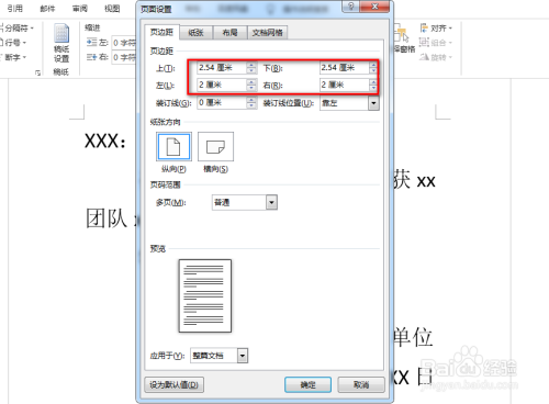 在弹出的对话框中,设置页边距的“上下摆布”大小,具体如图所示: