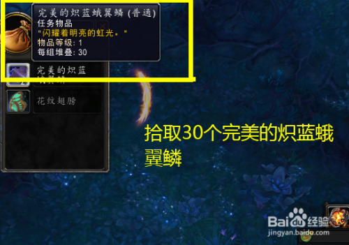 第五步,拾取30个完美的炽蓝蛾翼鳞。