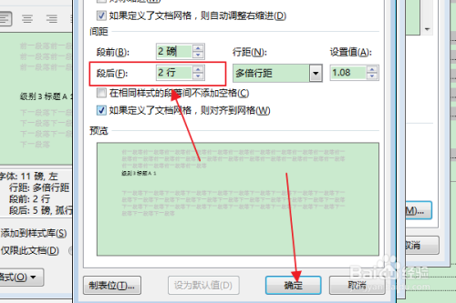 在弹出的“段落”对话框中,在间距栏中按照需要点窜“段后”数值(好比:2行),点击确定。