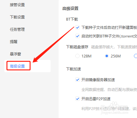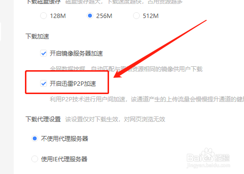 最后,在“下载加快”中,勾选“开启P2P加快”选项即可。如图: