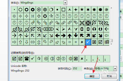 在弹出的“符号”对话框中,按照需要选择符号,点击确定。