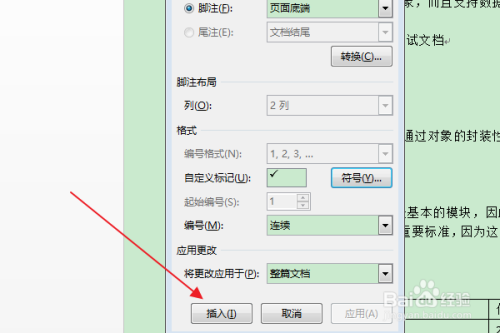 返回“脚注和从头至尾注”对话框,点击“插入”按钮。