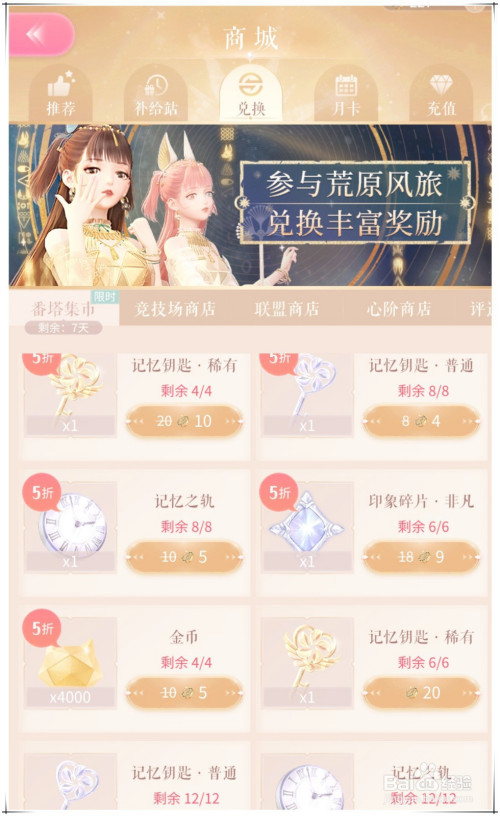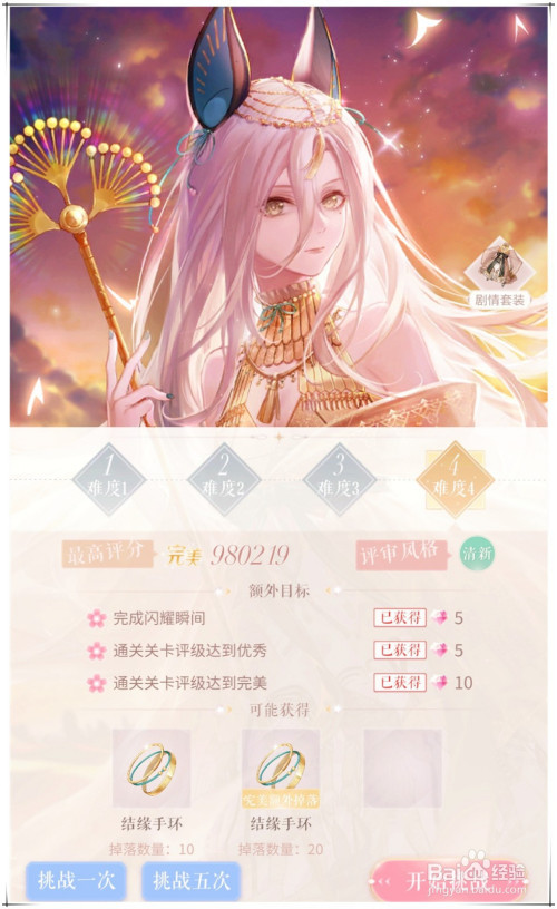 活动页面点“前去摄影”,右下角“挑战关卡”进入关卡页面,分帅气、典雅、甜美、清爽四大属性四种难度的挑战关卡,每日免费挑战5次。挑战关卡获得的道具结缘手环在“番塔集市”兑换钥匙、印象碎片、金币等奖励。