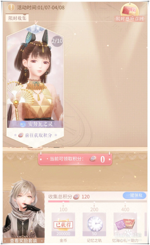 在荒漠风旅抽卡可获得活动积分,上方活动中间切换到“忆海收集”领取积分,收集总积分达到指定位置可领取奖励,最终获得洛昂套装“松间潜影”。