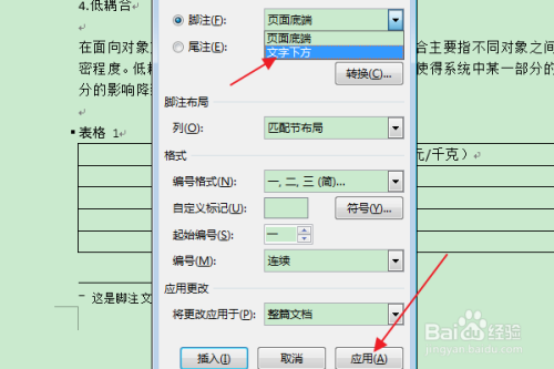 在弹出的“脚注和从头至尾注”对话框中,在“位置”栏中点窜脚注右侧下拉框为“文字下方”选项,点击“应用”。