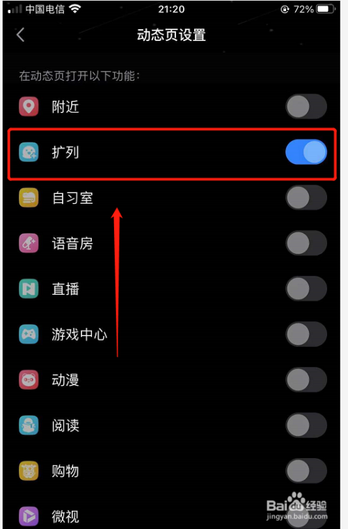 5、进入【动态页设置】界面,找到【扩列】选项,将其右侧的按钮打开,如下图;