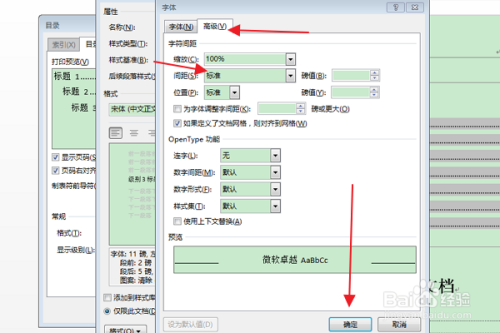 在弹出“字体”对话框中,切换到“高级”选项卡,将“间距”下拉框选为“尺度”,点击确定。
