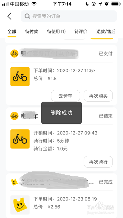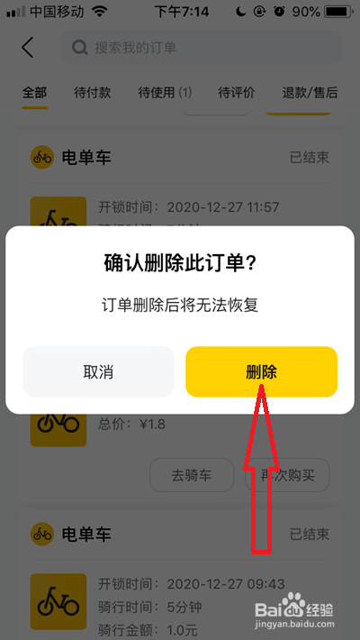 在弹出的窗口中,我们点击【删除】即可删除该订单,同理按此方式删除其它美团订单。(以下是删除当作功后的截图)